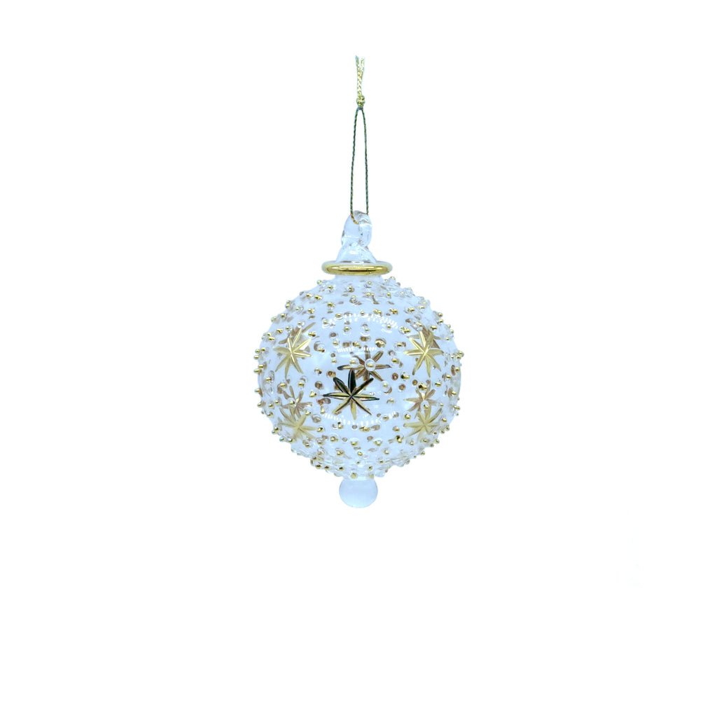 Hand made in Cairo in the area known as Gamaliya. Glass art has been made in Egypt as far back a the New Kingdom (1550-1070 BCE). Each ornament is made of Pyrex glass, stained, and accented with 18kt gold. Due to the hand made nature of these ornaments variations in size, color, and pattern are expected. These ornaments measure approximately: