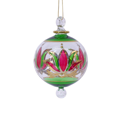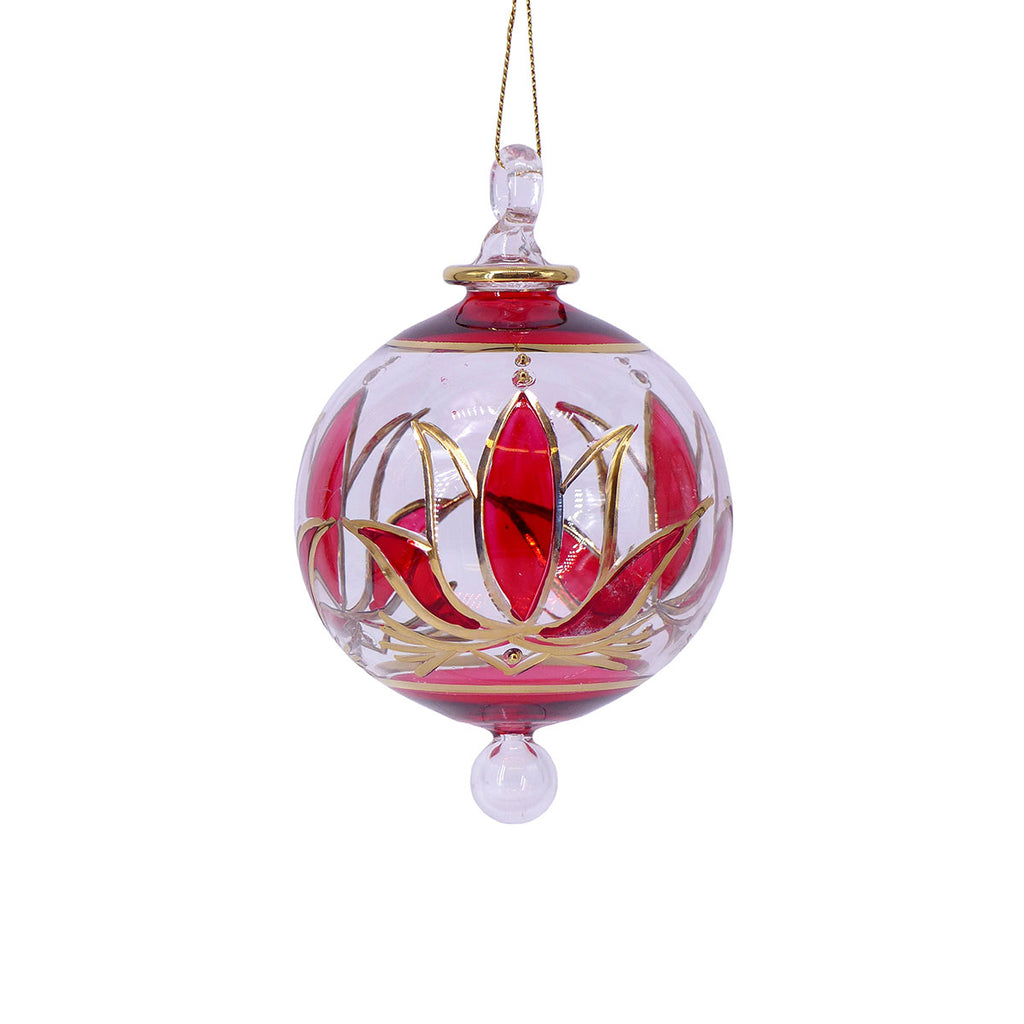 Hand made in Cairo in the area known as Gamaliya. Glass art has been made in Egypt as far back a the New Kingdom (1550-1070 BCE). Each ornament is made of Pyrex glass, stained, and accented with 18kt gold. Due to the hand made nature of these ornaments variations in size, color, and pattern are expected. These round ornaments measure approximately: