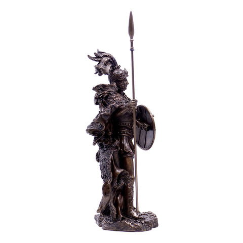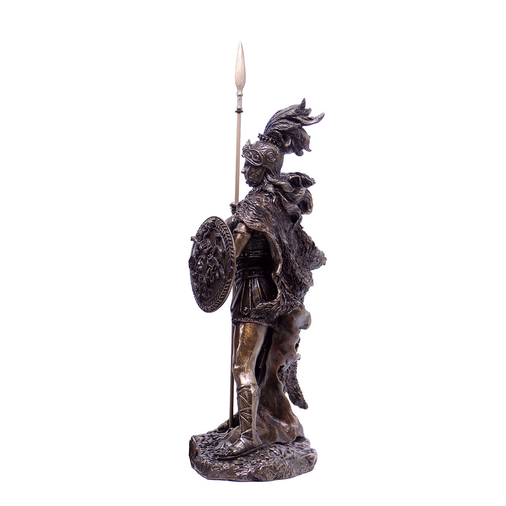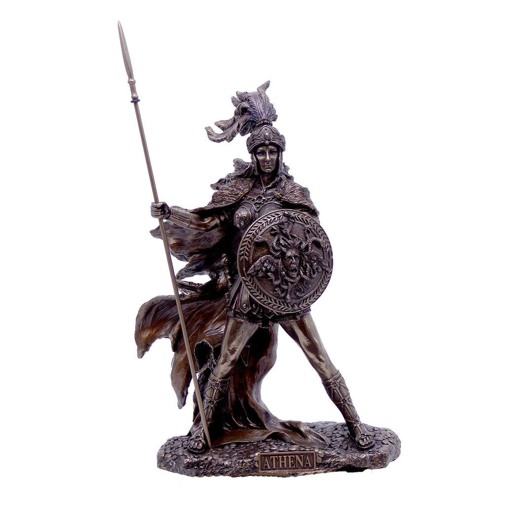 Athena was an ancient Greek god of many things. She was the god of strategic warfare, wisdom, courage, justice, and handicraft to name a few. This statue measures 10" tall (not including spear). It is made of a heavy resin and finished in cold cast metal (bronze/pewter).